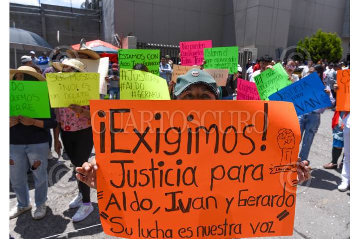 ALMOLOYA DE JUÁREZ, ESTADO DE MÉXICO, 03SEPTIEMBRE2025.- Con pancartas familiares, amigos y compañeros de Aldo, Iván y Gerardo se manifestaron al ritmo de la tambora en las inmediaciones de los Juzgados de Control de Almoloya de Juárez; acusados por extorsión sus familiares piden justicia. Originarios de este municipio, trabajan en choferes de taxis y músicos, sus conocidos exigen su libertad. FOTO: CRISANTA ESPINOSA AGUILAR/CUARTOSCURO.COM