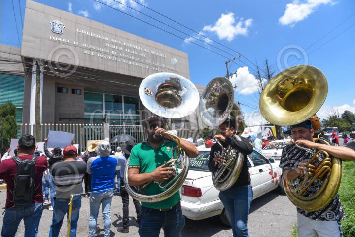 ALMOLOYA DE JUÁREZ, ESTADO DE MÉXICO, 03SEPTIEMBRE2025.- Al ritmo de la tambora, músicos, familiares, amigos y compañeros de Aldo, Iván y Gerardo se manifestaron en las inmediaciones de los Juzgados de Control de Almoloya de Juárez; acusados por extorsión sus familiares piden justicia. Originarios de este municipio, trabajan en choferes de taxis y músicos, sus conocidos exigen su libertad. FOTO: CRISANTA ESPINOSA AGUILAR/CUARTOSCURO.COM