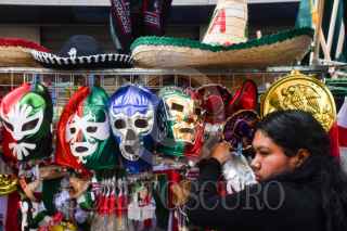 CIUDAD DE MÉXICO, 05SEPTIEMBRE2025.- Una mujer acomoda máscaras de lucha libre en un comercio de artículos para las fiestas patrias. FOTO: MARIO JASSO/CUARTOSCURO.COM