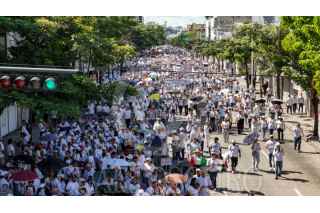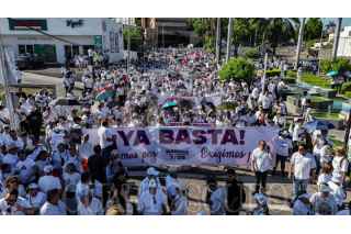 CULIACÀN, SINALOA, 09SEPTIEMBRE2025.- El 9 de Septiembre se cumple un año del estallido de violencia entre facciones del crimen organizado en Sinaloa por lo que miles de ciudadanos marcharon por las calles de Culiacán para exigir paz y justicia. La movilización partió desde la Parroquia Nuestra Señora de Guadalupe, conocida como La Lomita, y culminó en la Catedral Basílica del Rosario. Vestidos de blanco y portando banderas de México y de la paz, los manifestantes entre ellos empresarios, colectivos civiles, grupos de búsqueda, agricultores y familias alzaron la voz con mensajes como “El narco no manda, Sinaloa es nuestro” y “Ya basta, exigimos paz”, en una jornada marcada por el hartazgo social y la exigencia de un nuevo rumbo para la ciudad. FOTO: JOSÉ BETANZOS ZÁRATE/CUARTOSCURO.COM