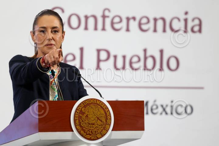 CIUDAD DE MÉXICO, 08SEPTIEMBRE2025.- Claudia Sheinbaum Pardo, presidenta de México, abordó el tema de los marinos y empresarios detenidos por contrabando de huachicol en puertos. Además, dio algunos detalles del paquete económico y, en este rubro, señaló que este año deben pagarse deudas de Pemex adquiridas durante el sexenio de Enrique Peña Nieto. Esto ocurrió durante la Mañanera del Pueblo. FOTO: MOISÉS PABLO / CUARTOSCURO.COM