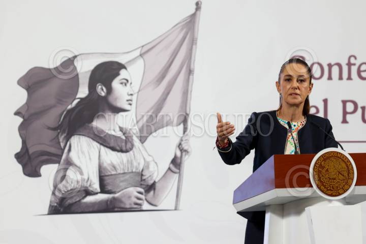 CIUDAD DE MÉXICO, 08SEPTIEMBRE2025.- Claudia Sheinbaum Pardo, presidenta de México, abordó el tema de los marinos y empresarios detenidos por contrabando de huachicol en puertos. Además, dio algunos detalles del paquete económico y, en este rubro, señaló que este año deben pagarse deudas de Pemex adquiridas durante el sexenio de Enrique Peña Nieto. Esto ocurrió durante la Mañanera del Pueblo. FOTO: MOISÉS PABLO / CUARTOSCURO.COM