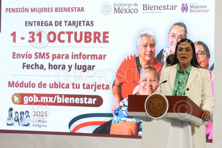 CIUDAD DE MÉXICO, 08SEPTIEMBRE2025.- Ariadna Montiel, secretaria del Bienestar, habló sobre la distribución de los recursos del programa para mujeres de 60 y más, y señaló a las beneficiarias que estén atentas para evitar fraudes. Les pidió consultar únicamente los canales oficiales, esto durante la Mañanera del Pueblo. FOTO: MOISÉS PABLO / CUARTOSCURO.COM