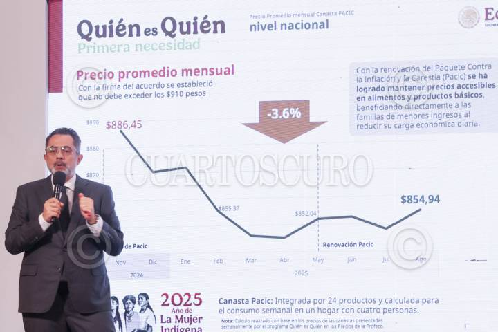 CIUDAD DE MÉXICO, 08SEPTIEMBRE2025.- Iván Escalante, director de la Profeco, muestra una gráfica en la que señala que el Paquete Contra la Inflación y la Carestía ha contribuido a disminuir la inflación en México, durante la Mañanera del Pueblo. FOTO: MOISÉS PABLO / CUARTOSCURO.COM