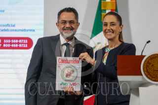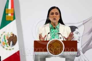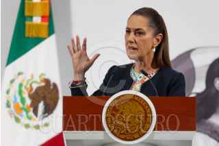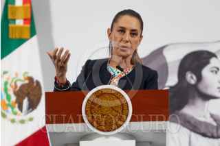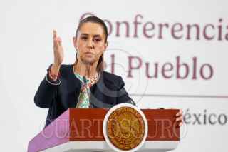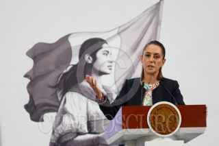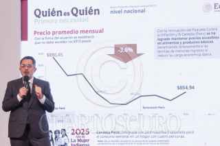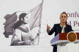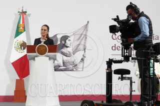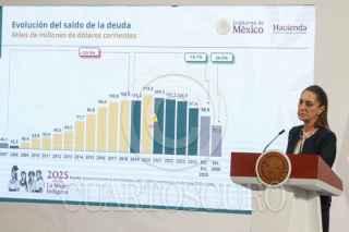 CIUDAD DE MÉXICO, 08SEPTIEMBRE2025.- Claudia Sheinbaum Pardo, Presidenta de México, señalo que en el Paquete Económico se contempla el pago de deuda contratada de Pemex que fue adquirida en el gobierno de Enrique Peña Nieto y descarto el cobro de nuevos impuestos, esto durante la Mañanera del Pueblo. En la imagen muestra una gráfica de como esa deuda a ido disminuyendo en los gobiernos de la 4T. FOTO: MOISÉS PABLO/CUARTOSCURO.COM