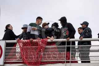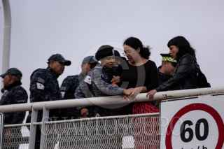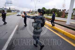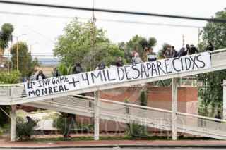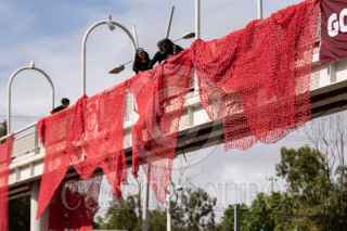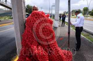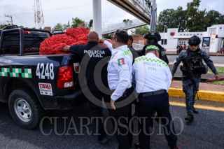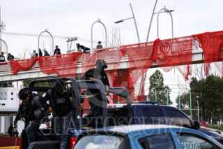 ZACATECAS, ZACATECAS, 08SEPTIEMBRE2025.- En el marco del 4to Informe de Gobierno de David Monrel, elementos de las Fuerzas de Reacción Inmediata de Zacatecas (FRIZ) y de Tránsito y vialidad del Estado, de manera agresiva impidieron una manifestación pacífica de acompañantes solidarias de familiares de desaparecidos “Colectiva Sangre de Mi Sangre”, quienes intentaron colocar el “tejido de rafia roja” que tejen en representación de las más de 130 mil personas desaparecidas en el país. A pesar de que el puente peatonal se encuentra a un kilómetro de distancia del lugar del evento, los elementos policiacos cortaron el tejido y fue llevado en vehículos de seguridad vial. FOTO: ADOLFO VLADIMIR /CUARTOSCURO.COM