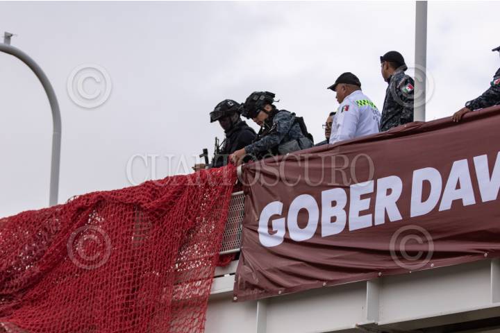 ZACATECAS, ZACATECAS, 08SEPTIEMBRE2025.- En el marco del 4to Informe de Gobierno de David Monrel, elementos de las Fuerzas de Reacción Inmediata de Zacatecas (FRIZ) y de Tránsito y vialidad del Estado, de manera agresiva impidieron una manifestación pacífica de acompañantes solidarias de familiares de desaparecidos “Colectiva Sangre de Mi Sangre”, quienes intentaron colocar el “tejido de rafia roja” que tejen en representación de las más de 130 mil personas desaparecidas en el país. A pesar de que el puente peatonal se encuentra a un kilómetro de distancia del lugar del evento, los elementos policiacos cortaron el tejido y fue llevado en vehículos de seguridad vial. FOTO: ADOLFO VLADIMIR /CUARTOSCURO.COM