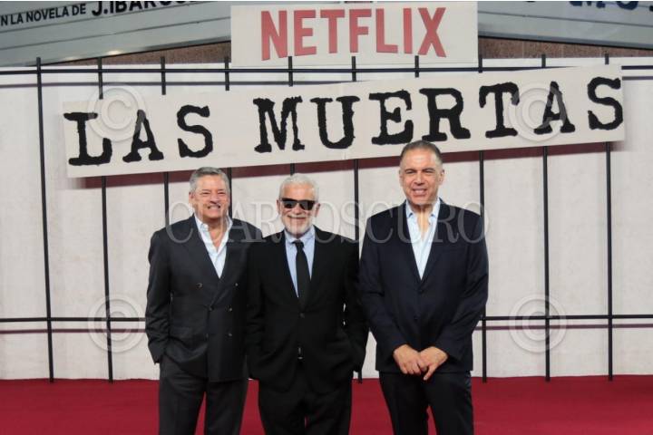 CIUDAD DE MÉXICO, 08SEPTIEMBRE2025.- Ted Sarandos, CEO Netflix, Luis Estrada, director de la serie "Las Muertas" y Paco Ramos, VP Content Netflix, durante la Alfombra Roja en la Cineteca Nacional. FOTO: GRACIELA LÓPEZ/CUARTOSCURO.COM