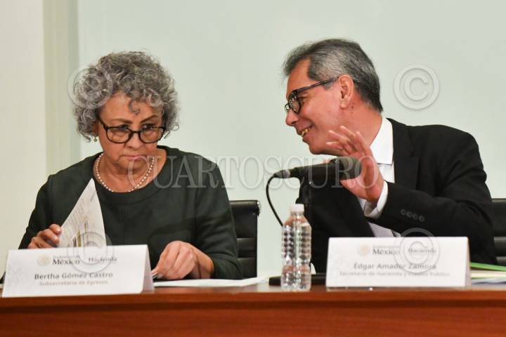 CIUDAD DE MÉXICO, 09SEPTIEMBRE2025.- Bertha Gómez Castro, subsecretario de Egresos, y Edgar Amador Zamora, secretario de Hacienda y Crédito Público, durante conferencia en la que se escribieron las características del Paquete Económico para el ejercicio fiscal 2026 el cual fue ayer recibido en el Congreso de la Unión. FOTO: MARIO JASSO/CUARTOSCURO.COM