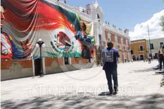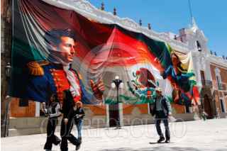 TLAXCALA, TLAXCALA, 09SEPTIEMBRE2025.- El Gobierno de Tlaxcala retiró mantas y murales conmemorativos por el mes patrio que fueron colocados a finales de agosto en el Palacio de Gobierno y el Congreso local, luego de que se detectaran errores en las imágenes generadas con inteligencia artificial, como héroes con seis dedos, escudos alterados y un águila similar a la de Estados Unidos. FOTO: ALAÍN HERNÁNDEZ /CUARTOSCURO.COM
