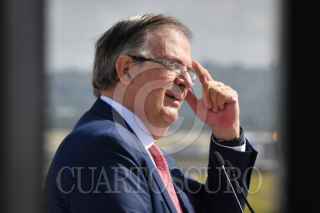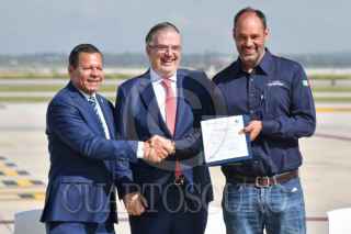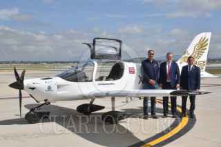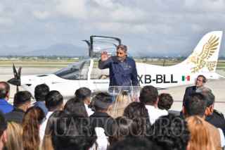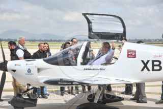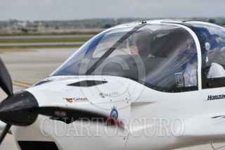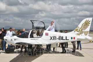 ZUMPANGO, ESTADO DE MÉXICO, 10SEPTIEMBRE2025.- Marcelo Ebrard, secretario de Economía, sube al "Halcón 2.1" de la empresa "Horizontec" para el vuelo de prueba. La aeronave recibió el certificado de aprobación tipo aeronave deportiva. FOTO: MARIO JASSO/CUARTOSCURO.COM