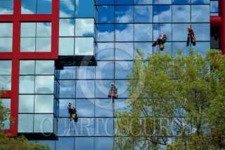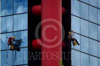 CIUDAD DE MÉXICO, 11SEPTIEMBRE2025.- Entre colores azules, verdes y rojos, los limpiavidrios del Corporativo Nacional de la Comisión Federal de Electricidad (CFE) destacan por sus utensilios amarillos. FOTO: GALO CAÑAS/CUARTOSCURO.COM