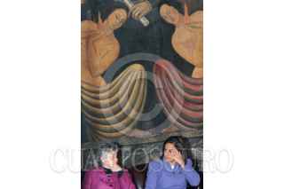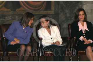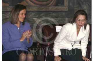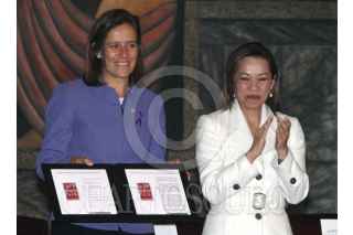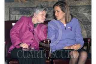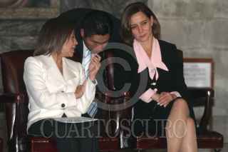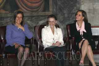 MÉXICO, D.F., 26NOVIEMBRE2007.-Maria del Rocio Garcia presidenta de Inmujeres y Margarita Zavala esposa del presidente Felipe Calderón durante la cancelacion del timbre postal contra la erradicación del la violencia contra las mujeres, realizado en las instalaciones de la SEP. FOTO: SAÚL LÓPEZ/CUARTOSCURO.COM