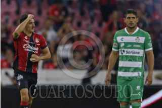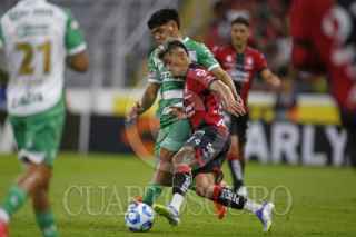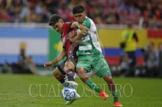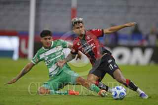 GUADALAJARA, JALISCO, 13SEPTIEMBRE2025.- Diego González, jugador de Atlas, disputa el balón con el contrario de Santos, Jonathan Pérez, esto en partido correspondiente a la jornada 8 del Torneo Apertura 2025 de la Liga MX, en donde se enfrentan los equipos de Atlas vs Santos, en juego que se lleva a cabo en el Estadio Jalisco, el marcador al momento es de 2-1 a favor del equipo local. FOTO: FERNANDO CARRANZA GARCIA / CUARTOSCURO.COM