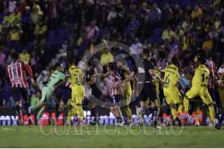 CIUDAD DE MÉXICO, 13SEPTIEMBRE2025. Conato de bronca durante el partido de fútbol América vs Guadalajara correspondiente a la jornada 8 del Torneo Apertura 2025 de Liga BBVA MX, en el Estadio Ciudad de los Deportes. FOTO: EDGAR NEGRETE LIRA/CUARTOSCURO.COM