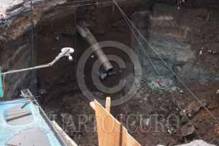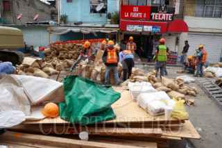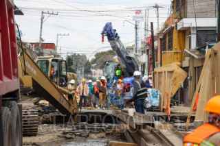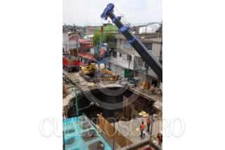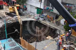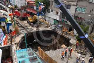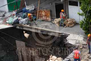 CIUDAD DE MÉXICO, 15SEPTIEMBRE2025.- Continúan los trabajos de reparación del socavón de avenida 5, en la colonia Renacimiento de la alcaldía Iztapalapa, la oquedad actualmente tiene un diámetro de 8 metros. Trabajadores de la alcaldía y del gobierno capitalino se encuentran apuntalandolo para evitar daños a las casas aledañas, sin embargo, tres familias fueron evacuadas por seguridad. Vecinos comentan que estos socavones se forman por qué debajo de la colonia se encuentra el desagüe de aguas negras y que esté se ve afectado por el paso del transporte pesado. FOTO: MOISÉS PABLO/CUARTOSCURO.COM