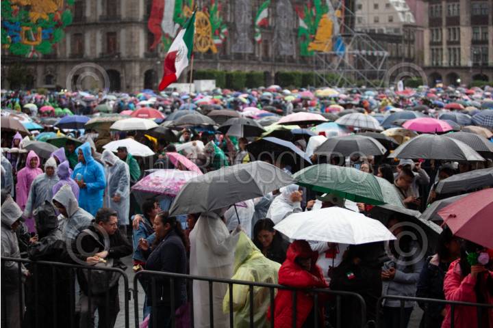 CIUDAD DE MÉXICO, 15SEPTIEMBRE2025.- Aunque una lluvia ligera no cesa, la plancha del zócalo capitalino luce casi llena por la gente que viene a presenciar el grito de la presidenta Claudia Sheinbaum con motivo del aniversario de la Independencia de México. FOTO: ANDREA MURCIA /CUARTOSCURO.COM