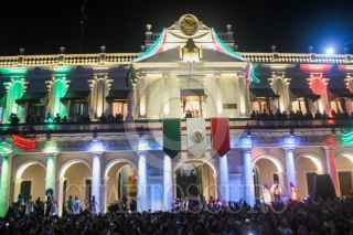 XALAPA, VERACRUZ, 15SEPTIEMBRE2025.- La gobernadora Rocío Nahle dio el grito de Independencia ante cientos de ciudadanos que se congregaron en la Plaza Lerdo. Sin embargo, a la par de los festejos, las consignas de colectivos de desaparecidos también se escucharon. FOTO: YERANIA ROLÓN/CUARTOSCURO.COM