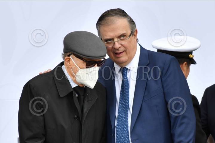 CIUDAD DE MÉXICO, 16SEPTIEMBRE2025.- Alejandro Gertz Manero, fiscal general de la República, y Marcelo Ebrard, secretario de Economía, previo al desfile cívico militar conmemorativo del 215 Aniversario de la Independencia en México que partió del zócalo capitalino. FOTO: MARIO JASSO/CUARTOSCURO.COM