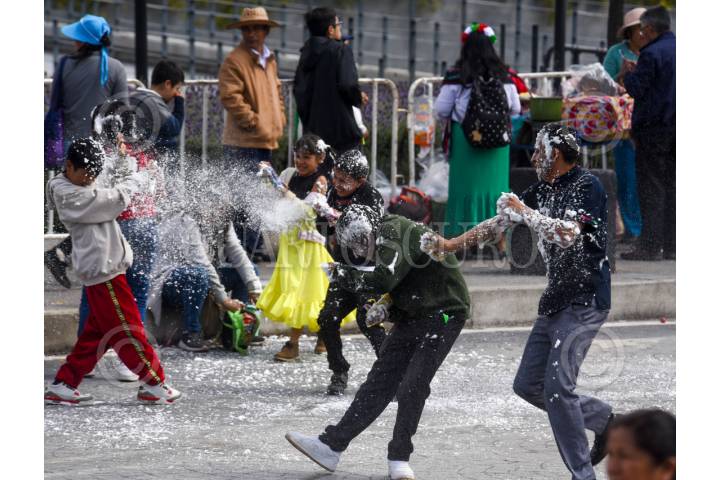 TOLUCA, ESTADO DE MÉXICO, 16SEPTIEMBRE2025.- Niños y adultos usando espumas al término de el Desfile Cívico Militar conmemorativo por el 215 Aniversario de la Independencia de México que se realizó en la capital mexiquense, a pesar de que fue prohibido el uso y venta de estas por el ayuntamiento de Toluca, como una medida preventiva para prevenir confrontaciones como se han dado en años anteriores. FOTO: CRISANTA ESPINOSA AGUILAR/CUARTOSCURO.COM