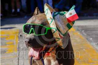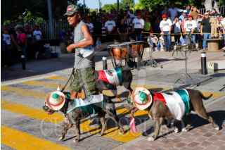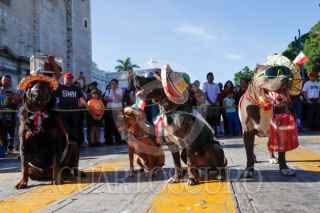 MÉRIDA, YUCATÁN, 16SEPTIEMBRE2025.- Minutos antes de iniciar el desfile con motivo del 215 aniversario del inicio de la independencia de México, una persona en situación de calle desfiló junto a su jauría de perros quienes portaron vistosos atuendos alusivos a las fiestas patrias mientras los asistentes los recibieron con aplausos. FOTO: MARTIN ZETINA/CUARTOSCURO.COM