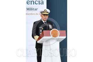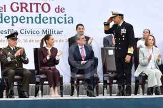 CIUDAD DE MÉXICO, 16SEPTIEMBRE2025.- Claudia Sheinbaum, presidenta de México y Raymundo Pedro Morales Ángeles, secretario de Marina, y durante el desfile cívico militar conmemorativo del 215 Aniversario de la Independencia en México en el zócalo capitalino. El Almirante, señaló durante su discurso: “Fue muy duro aceptarlo, pero hubiera sido imperdonable callarlo” refiriéndose al caso de corrupción en el contrabando de combustible que involucró a varios miembros se la Semar. FOTO: MARIO JASSO/CUARTOSCURO.COM