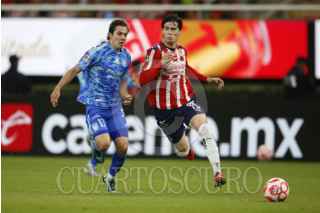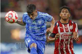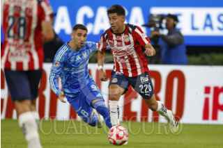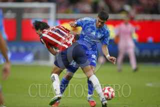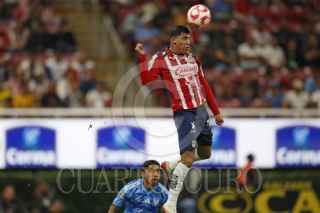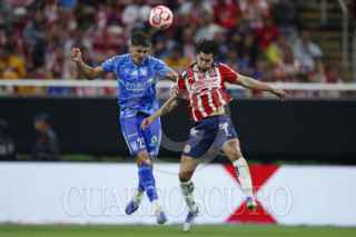 ZAPOPAN, JALISCO, 17SEPTIEMBRE2025.- Bryan González jugador de Chivas disputa el balón con el contrario de Tigres Javier Aquino, esto en partido correspondiente jornada 1 del Torneo Apertura 2025 de la Liga MX, en donde se enfrentan los equipos de Chivas vs Tigres y en juego que se lleva a cabo en el Estadio Akron, el marcador al momento es de 0-0. FOTO: FERNANDO CARRANZA GARCIA / CUARTOSCURO.COM