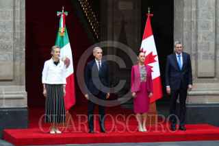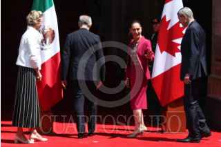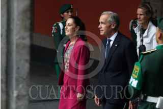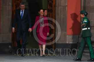 CIUDAD DE MÉXICO, 18SEPTIEMBRE2025.- Claudia Sheinbaum, presidenta de México, se despidió junto con Diana Fox, cónyuge de Mark Cartney, primer Ministro de Canadá, y su esposo Jesús María Tarriba, durante su recibimiento al Patio de Honor en Palacio Nacional. FOTO: GRACIELA LÓPEZ/CUARTOSCURO.COM