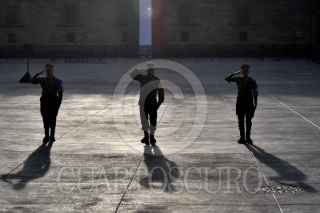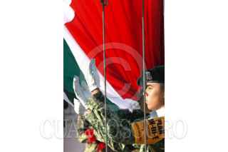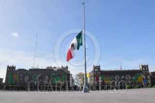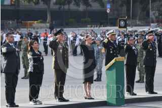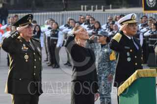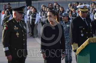 CIUDAD DE MÉXICO, 19SEPTIEMBRE2025.- Claudia Sheinbaum, presidenta de México, encabezó la ceremonia de izamiento de bandera nacional a media asta en memoria de las víctimas de los sismos de 1985 y 2017, realizada en el zócalo capitalino. La acompañan: Omar García Harfuch; Clara Brugada, jefa de Gobierno; Ricardo Trevilla Trejo, secretario de la Defensa Nacional, Raymundo Morales, secretario de Marina, y Rosa Icela Rodríguez, secretaria de Gobernación. FOTO: MARIO JASSO/CUARTOSCURO.COM