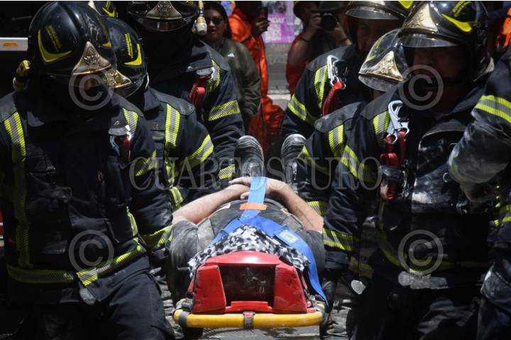 CIUDAD DE MÉXICO, 19SEPTIEMBRE2025.- Personal del Heroico Cuerpo de Bomberos realizaron ejercicios hipotéticos de rescate sobre avenida Juárez durante el Simulacro Nacional 2025 en el marco del aniversario de los sismos de 1985 y 2017. El macro simulacro se realiza con el propósito de fomentar la cultura de la protección civil en la población y contribuir con el fortalecimiento de las capacidades de reacción ante dicho fenómeno natural. FOTO: MARIO JASSO/CUARTOSCURO.COM