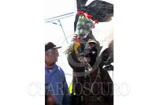 Marcos levanta una ramo de flores que le regalaron durante el acto civico en Zitacuaro a su lado Fernando Yañez "El comandante German". FOTO: Pedro Mera/CUARTOSCURO.COM