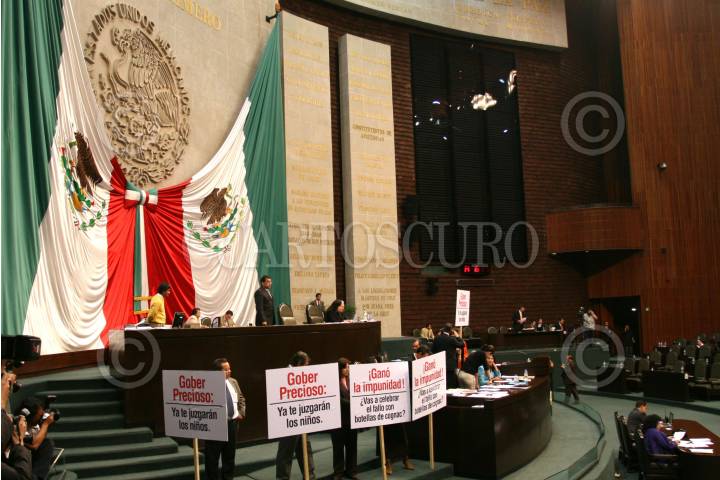 MÉXICO D.F. 04DICIEMBRE2007.-Diputados del Partido Nueva Alianza, muestran unas pancartas con diversas leyendas, esto por fallo de la Suprema Corte de Justicia en el caso de la periodista Lydia Cacho.En la imagen un diputado rompe uno de los carteles utilizados por los diputados de Nueva Alianza. FOTO:GUILLERMO PEREA/CUARTOSCURO.COM