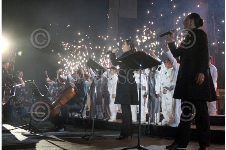 MONTERREY, NUEVO LEON 09DICIEMBRE2007.- Se llevo a cabo de manera oficial la clausura del forum universal de las culturas Monterrey 2007, el gobernador del estado. Jose Natividad Gonzalez Paras, acompañado del alcalde Adalberto Madero, dieron su mensaje y se encargaron de entregar la estafeta al alcalde de Valparaiso, Chile, ciudad que serà la proxima sede del forum universal de las culturas en el 2010. El acto del Himno Nacional estuvo interpretado por la cantante Eugenia Leòn. FOTO: PEDRO KRISTIAN LOPEZ/CUARTOSCURO.COM