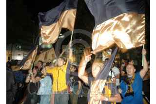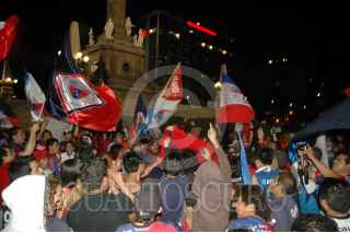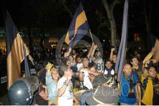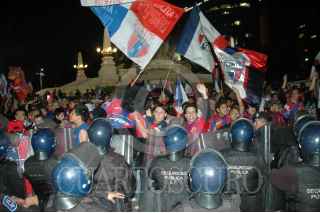 MÉXICO D.F., 09DICIEMBRE2007.- Un grupo reducido de fans de los Pumas de la UNAM se reunen en los alrededores del Angel de la Independecia y son resguardados por elementos de seguridad pública para evitar algun confrontamientos con los cientos de seguidores de los potros del Atlante que festejan el triunfo. FOTO: RODOLFO ANGULO/CUARTOSCURO.COM