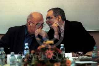 MEXICO, D.F, 08MARZO2001.-El periodista polaco Ryszard Kapuscinski junto a Gabriel García Marquez en el foro de periodismo que organiza la UIA . FOTO: Pedro Valtierra/ CUARTOSCURO.COM