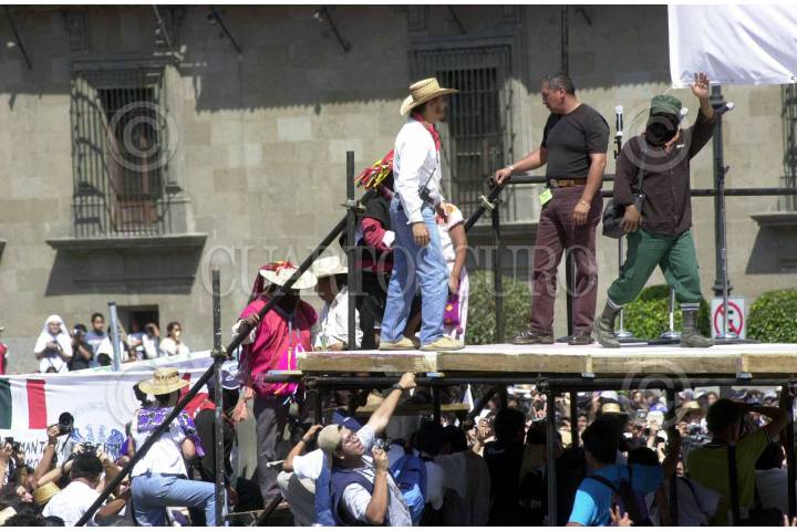 Tumultuosa bienvenida se le dio al subcomandante Marcos y la comandancia del EZLN a su llegada al Zocalo de la ciudad de Mexico, ultimo punto de la marcha zapatista. Foto: David Bolaños/CUARTOSCURO.COM