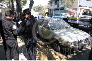 MÉXICO D.F., 09ENERO2008.- En las calles de la colonia Héroes de Padierna, la policía encontró un auto Tsuru robado hace un mes, en el interior se pensaba que había una persona encajuelada pero resulto tener pollos y jamón en descomposición. El auto fue trasladado al ministerio público para entregarlo a su dueño. FOTO: PEDRO MARRUFO/CUARTOSCURO.COM