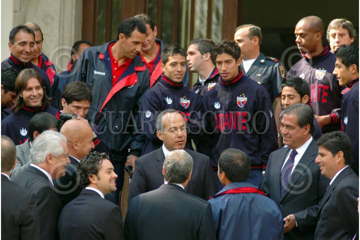 MÉXICO D.F., 11ENERO2008.- El presidente Felipe Calderón se toma la fotografía oficial con jugadores y directivos del club Atlante que visitaron la residencia oficial de Los Pinos. FOTO: RODOLFO ANGULO/CUARTOSCURO.COM