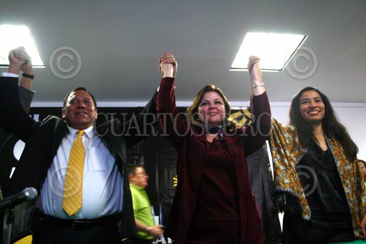 MÉXICO,D.F 25ENERO2008.- Ruth Zavaleta, presidenta de la mesa directiva de la Cámara de Diputados, Elena Tapia, el senador Rene Arce, el asambleista Victor Hugo Cirigo y Jesús Zambrano después de haberse registrado como candidatos a la presidencia y secretaría general del PRD del Distrito Federal. FOTO: IVAN MENDEZ/CUARTOSCURO.COM