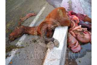 CHAPALA, JALISCO, 31ENERO2008.- Así quedó este caballo, que fué atropeyado en las primeras horas del dia, en la Carretera Poniente Chapala - Jocotepec en el cruce con Rio Lerma, justo en frente de una escuela. FOTO: MARIA DI PAOLA/CUARTOSCURO.COM