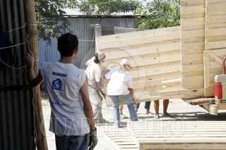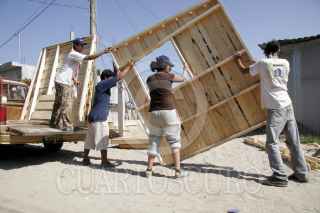 VILLAHERMOSA, TABASCO, 31ENERO2008.- Voluntarios altruistas latinoamericanos de “Un Techo para mi País” continuan con los trabajos de construcción de casas dignas desde esta mañana para Chocos que resultaron afectados en las pasadas inundaciones. En la imagen los jóvenes estudiantes bajan el material cien por ciento de madera con la que fabrican las casas a una familia que salio beneficiada en la colonia Asunción Castellanos. FOTO: MARCO POLO GUZMÁN HERNÁNDEZ/CUARTOSCURO.COM