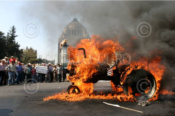 MÉXICO, D.F. 31ENERO2007.- Campesinos iniciaron la mega marcha en contra del TLC. Antes de iniciar en el monumento de la revolución, quemaron un tractor, que minutos mas tarde fué apagado por os bomberos, Durante la mañana suiguieron llegando miles de manifestantes para unirse a la protesta por lo que la policia realizó cortes en la vialidad. FOTO: PEDRO MARRUFO/CUARTOSCURO.COM
