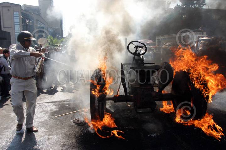 MÉXICO, D.F. 31ENERO2007.- Campesinos iniciaron la mega marcha en contra del TLC. Antes de iniciar en el monumento de la revolución, quemaron un tractor, que minutos mas tarde fué apagado por os bomberos, Durante la mañana suiguieron llegando miles de manifestantes para unirse a la protesta por lo que la policia realizó cortes en la vialidad. FOTO: PEDRO MARRUFO/CUARTOSCURO.COM