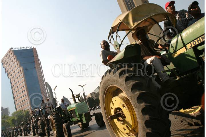 MÉXICO, D.F., 31ENERO2008.- Campesinos acompañados de sus tractores de varios estados del país participaron en mega marcha en contra de la entrada en vigor del último capítulo del Tratado de Libre Comercio con América del Norte en materia de productos del campo, como maíz y frijo. Ellos han señalado que este acuerdo comecial firmado hace diez años los pone en franca desventaja con los campesinos del país del norte. FOTO: MOISÉS PABLO/CUARTOSCURO.COM