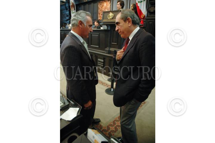 MÉXICO D.F., 14FEBRERO2008.- El senador del PRD Pablo Gomez de la pasa unas muestras de cajetillas de cigarro al senador Ricardo Monreal como muestra para la nueva ley anti tabaco durante la sesión ordinaria en el Senado de la República. FOTO: RODOLFO ANGULO/CUARTOSCURO.COM