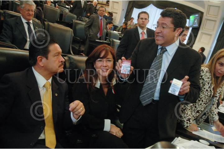 MÉXICO D.F., 14FEBRERO2008.- El senador del PRD Pablo Gomez de la pasa unas muestras de cajetillas de cigarro al senador Ricardo Monreal como muestra para la nueva ley anti tabaco durante la sesión ordinaria en el Senado de la República. FOTO: RODOLFO ANGULO/CUARTOSCURO.COM