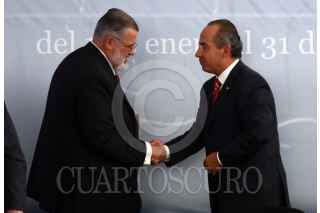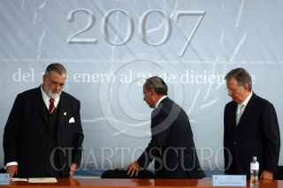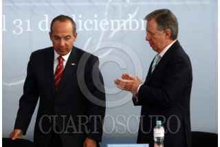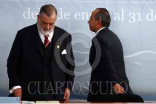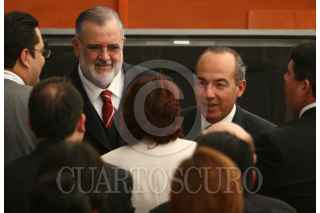 MÉXICO,D,F 15FEREBRO2008.- José Luis Soberanes Presidente de la CNDH el Presidente de los Estados Unidos Mexicanos Felipe Calderon Hinojosa durante el informe de actividades del ombusdman en las instalaciones de la CNDH al sur de la ciudad de México FOTO: SASHENKA GUTIERREZ/CUARTOSCURO.COM