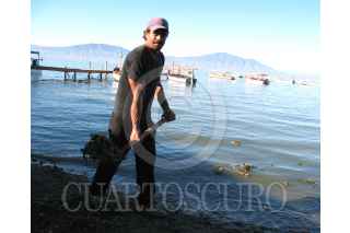 CHAPALA,JALISCO.- 16FEBRERO2008.- Volvió a extenderse el lirio en el lago de Chapala y no le quedó de otra a los elementos de Parques y jardines del Ayuntamiento de Chapala que recojerlo a mano con la pala. FOTO: MARIA DI PAOLA/CUARTOSCURO.COM