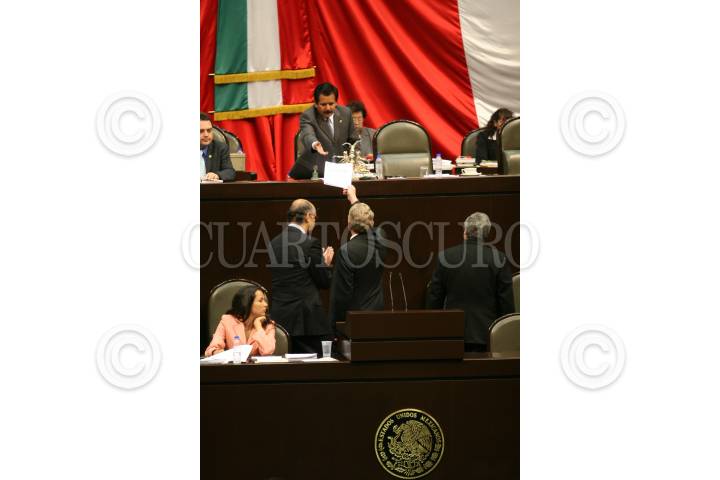 MÉXICO D.F. 04MARZO2008.-Sesión ordinaria en la Cámara de Diputados donde fue solicitada una comisión especial para investigar los contratos de PEMEX y CFE a terceros.En la imagen los diputados Claudia Cruz y Alberto Esteva de (Convergencia) muestran una manta con la leyenda ¿Las Manos Limpias? FOTO: GUILLERMO PEREA /CUARTOSCURO.COM