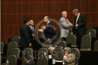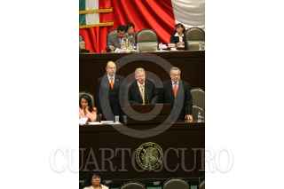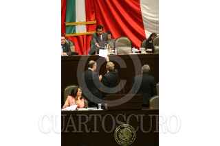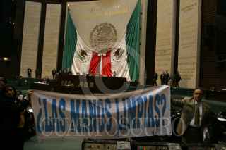 MÉXICO D.F. 04MARZO2008.-Sesión ordinaria en la Cámara de Diputados donde fue solicitada una comisión especial para investigar los contratos de PEMEX y CFE a terceros.En la imagen los diputados Claudia Cruz y Alberto Esteva de (Convergencia) muestran una manta con la leyenda ¿Las Manos Limpias? FOTO: GUILLERMO PEREA /CUARTOSCURO.COM